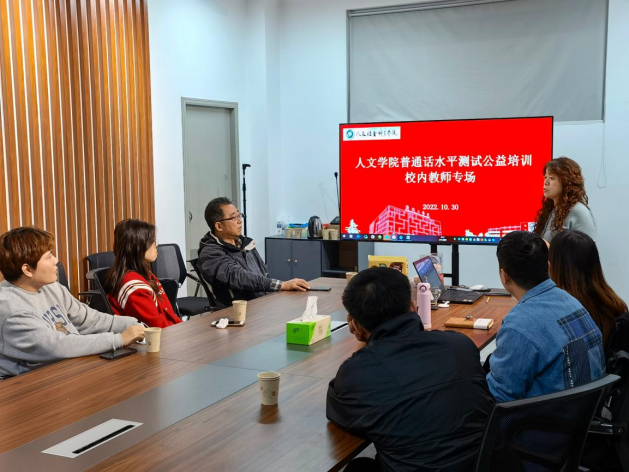 10月30日晚,人文学院在仁和楼A302开展普通话水平测试公益培训,来自校内10余名教师参加,培训由人文学院院长周晓燕教授主讲。