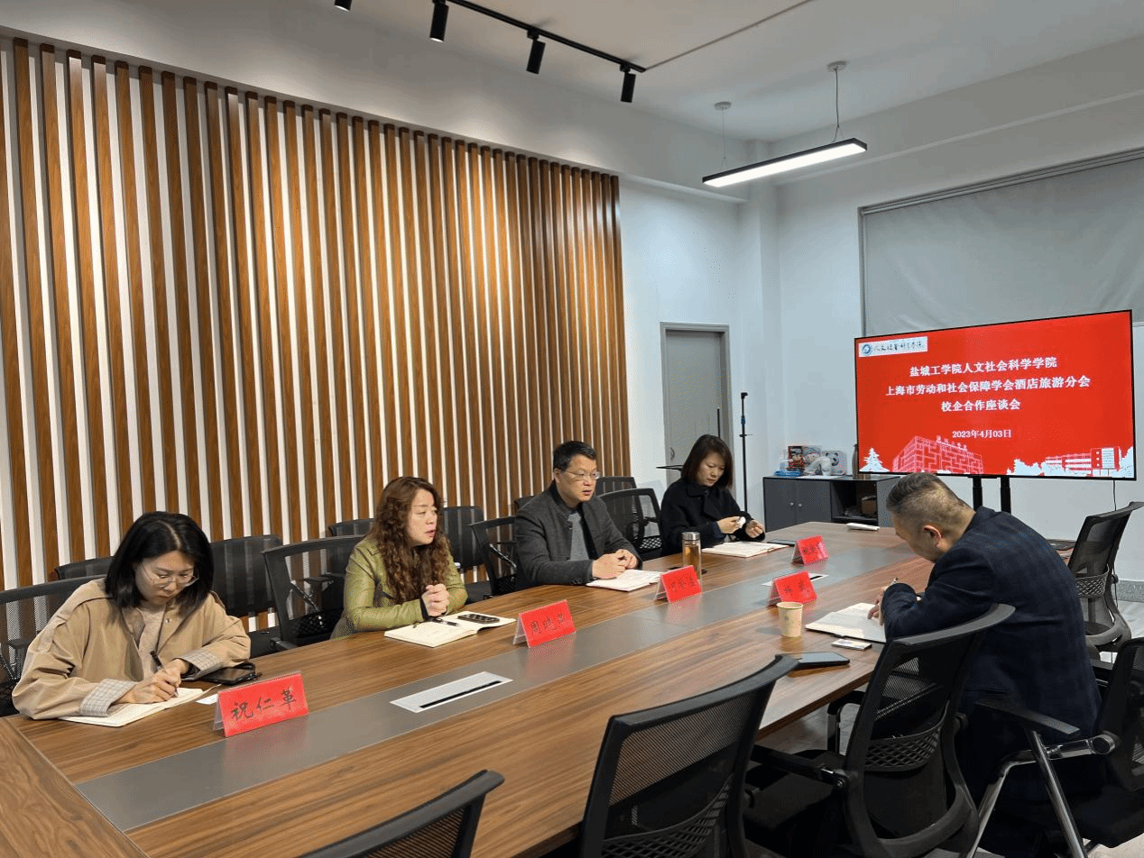 4月3日下午,在南校区仁和楼A302会议室,上海市劳动和社会保障学会酒店旅游分会长杨武来我院洽谈校企合作事宜。院长周晓燕主持会议,党总支书记何登溢、党总支副书记姚爱华、酒店系主任祝仁革参加。