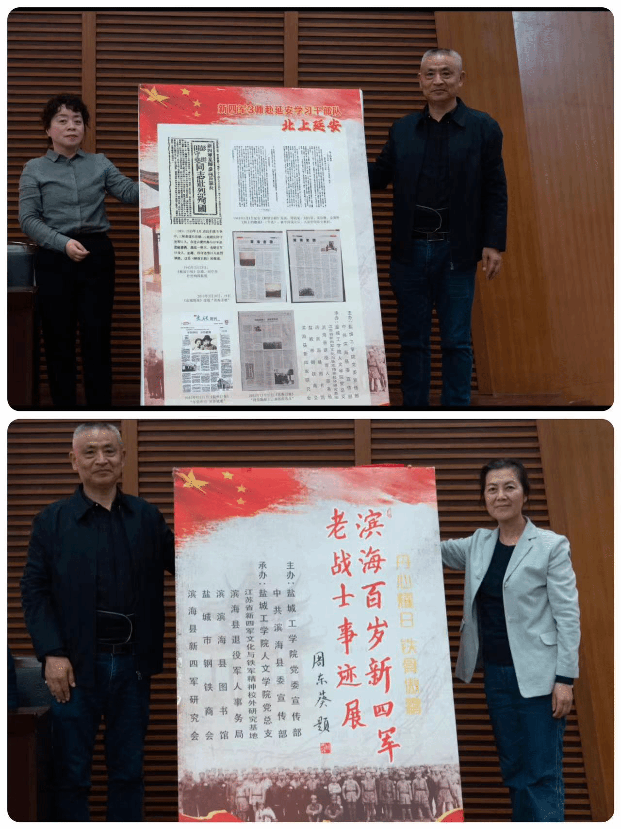 何登溢在致辞中讲到,新四军老战士是中国革命的亲历者和见证人,他们的英勇事迹是后辈珍贵的研习资源。周晓燕携手北京军区空军副司令员、百岁新四军老战士乔子扬长女乔雪松共同为“滨海百岁新四军老战士事迹展”•“北上延安展”揭幕,她勉励在场学生要用实际行动担负起历史赋予当代青年的伟大使命。