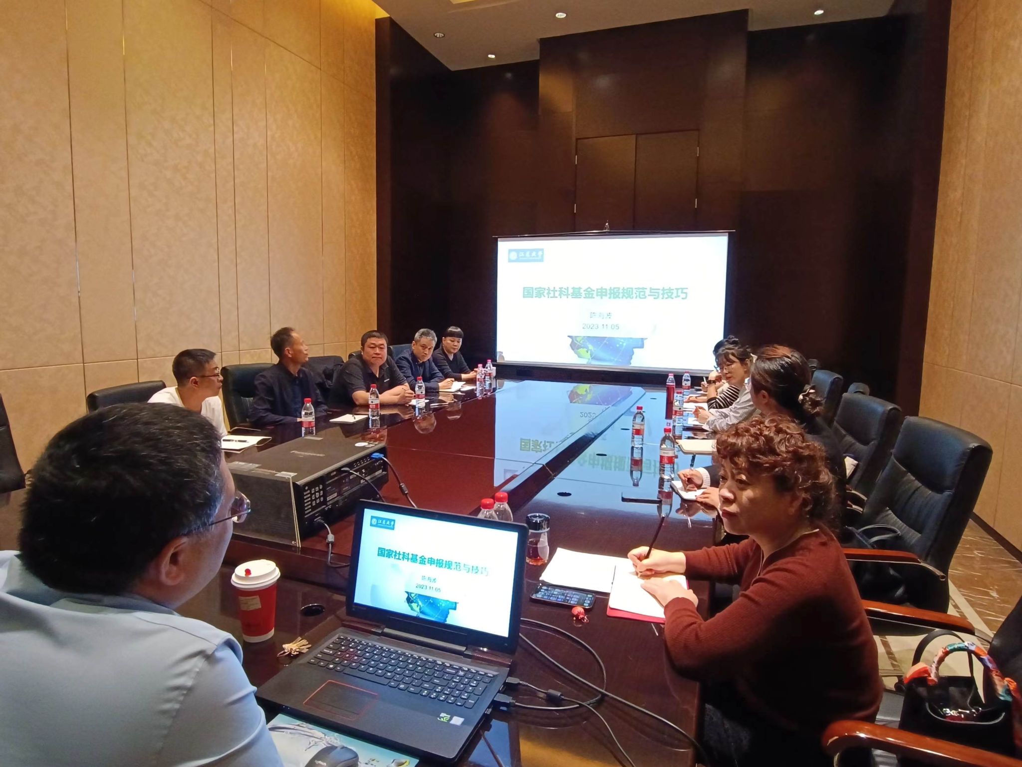 陈海波教授为与会教师做“国家社科基金申报规范与技巧”讲座,他从精细审题、明确领域、问题导向、精辟论证、重视形象、精益求精等几个方面,以身说法深度分享国家社科基金项目申报过程中的重要体会与关键点,从选题、研究内容、研究方法等方面为大家提供了宝贵建议。与会教师们积极发言,就自己在国家社科基金申报工作中遇到的问题和困惑向陈教授请教,陈教授逐一解释答疑,提出了许多针对性强的指导意见。