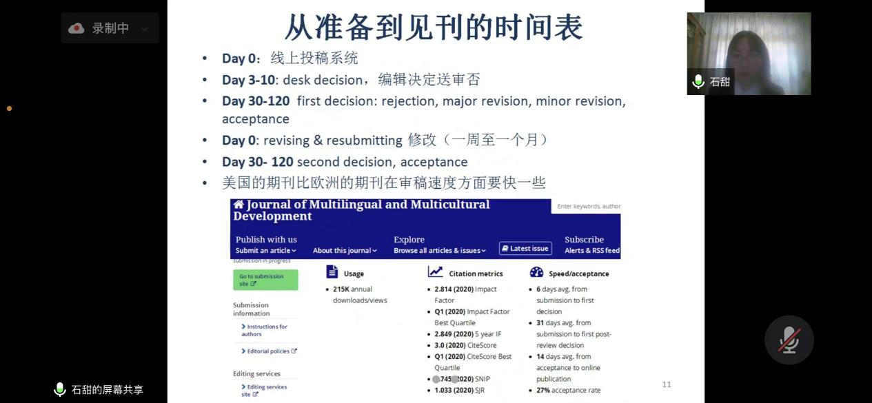石博士主要从什么是SSCI、如何选择适合的期刊、SSCI发表与CSSCI发表比较、从准备到见刊的时间表、常见的发表难点这五个方面进行,并给大家推荐了相关的写作工具和书籍。