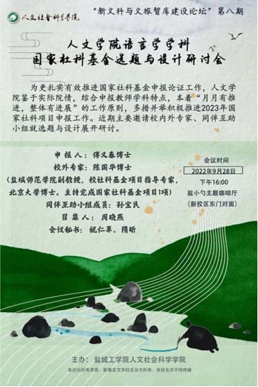 9月28日下午,为更扎实有效推进2023年国家社科基金申报论证工作,人文学院基于实际院情,综合申报教师学科特点,在校外开展语言学学科小型专场研讨会。会议采用“专家指导+同伴互助”形式,由周晓燕院长主持,傅义春博士,孙宝民老师,隋昕博士、祝仁革博士等参加会议。