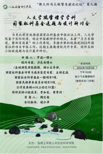 10月5日下午,人文学院“2023年国家社科基金选题与设计”系列研讨会之“管理学”学科专场如期而至。会议由陶文俊副院长主持,周晓燕院长、湿地生态旅游研究中心主任李如友、黄常州博士、罗成一博士,隋昕博士、祝仁革博士等参加研讨。