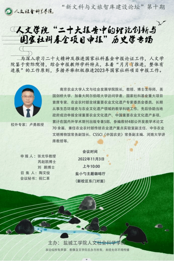 本次研讨会邀请了国家社科基金重大项目首席专家、南京农业大学人文与社会发展学院院长卢勇进行指导。卢院长分别为张光华教授、芮赵凯博士、刘鹏博士的本子从课题名称、课题组成员、文献综述、重点难点、创新之处等几方面进行了详细指导,并强调指出模式要规范、史料要丰富、技术路线图要精致等细节问题。