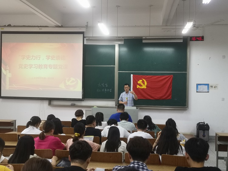 6月11日下午,在南校区博学楼C102,人文学院党总支副书记何登溢为全体学生党员上“学史崇德,学史力行”专题党课,学院72名学生党员聆听了报告。