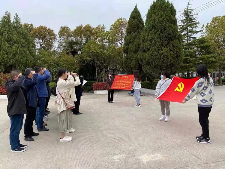 师生党员在纪念碑前与党旗合影