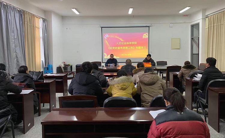 1月6日下午,在仁和楼A304,人文学院组织全体教职工学习《论党的宣传思想工作》,学院党总支副书记何登溢主讲,院长衣传华及全体教师参与学习。
