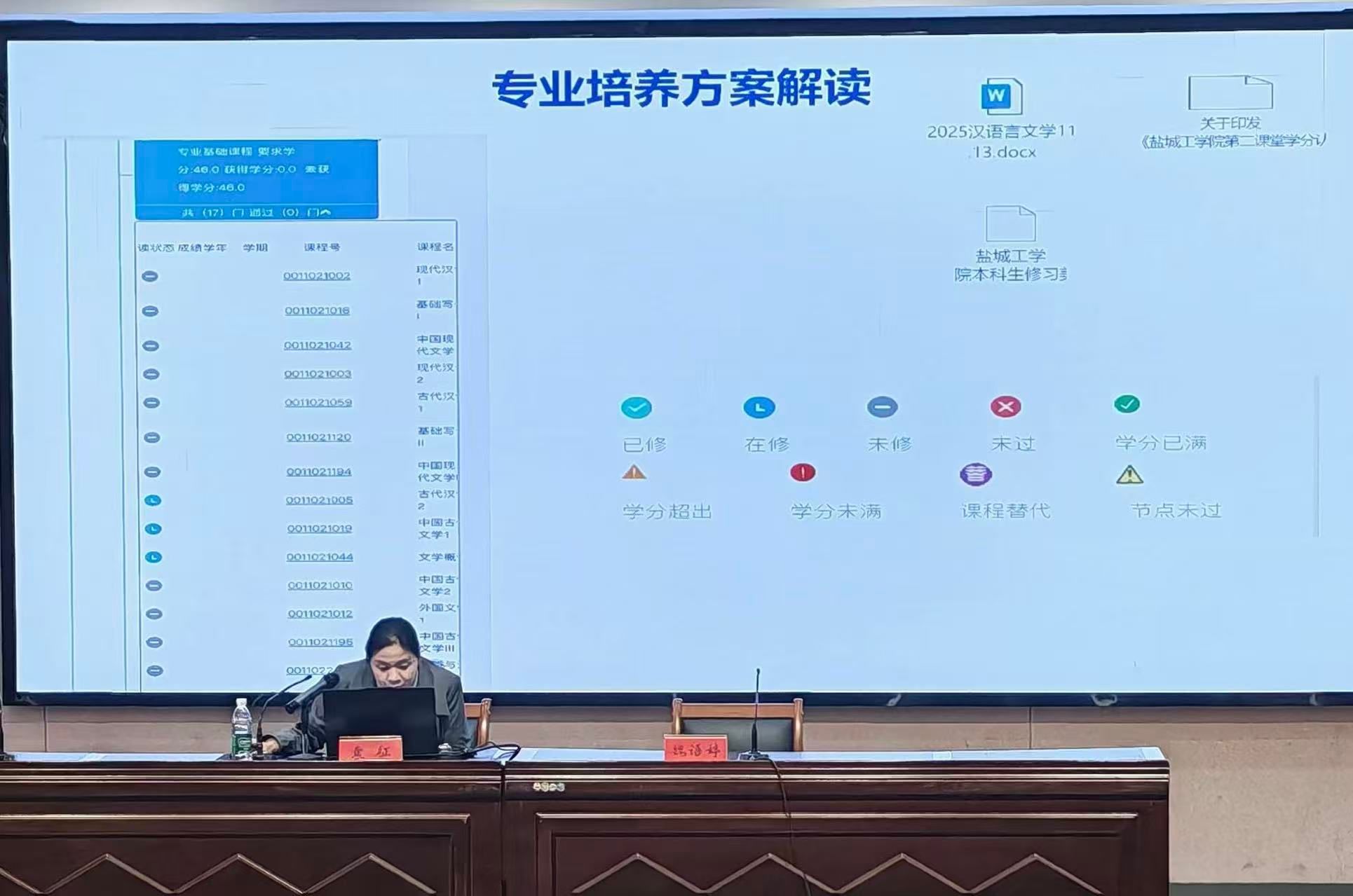 袁征为新生系统讲解学籍管理、学业预警以及专业培养方案等内容,引导新生从入学伊始即高度重视学业规范。她结合学校教务文件,详细解读了课程考核与成绩记载、学位授予条件、学业进度要求以及考试违规处理办法等内容,系统回应了同学们普遍关注的挂科重修问题。她勉励全体新生深入理解学分认定与积累规则,进一步增强责任意识,科学规划大学学业发展。