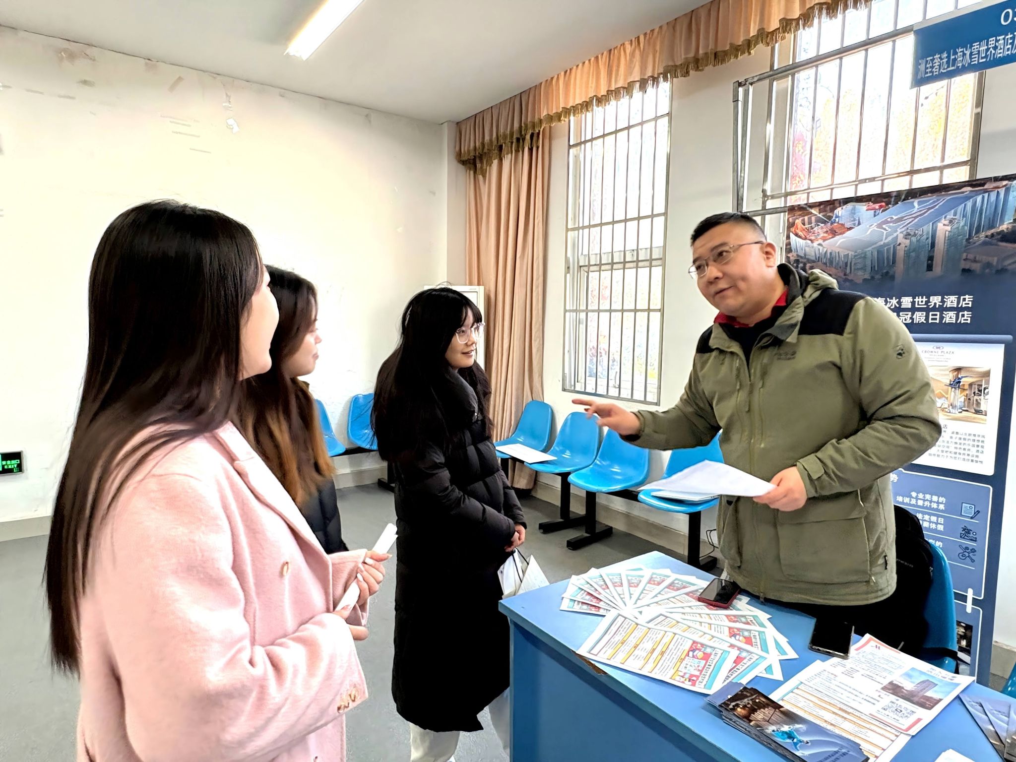 本次招聘会共有35家文旅行业的企业参会,其中包括万豪、希尔顿、锦江、洲际、华住等享誉国内外的酒店集团以及盐城市盐南高新区新东方文化艺术有限公司、江苏粉笔培训中心有限公司、盐城先行教育科技有限公司、江苏海马纺织机械有限公司、江苏淘米信息科技有限公司等诸多优质企业,累计提供300余个就业岗位。活动现场各参展企业通过宣传海报、宣传册、企业视频等多种形式展示企业文化、岗位需求。招聘会现场气氛热烈,秩序井然。毕业生们手持精心准备的简历,积极与用人单位交流,主动了解岗位要求、发展路径及企业文化,并结合自身专业与职业规划寻找心仪机会。企业代表也通过面对面沟通,向同学们详细介绍公司概况、岗位职责与人才培养机制,实现高效双向选择。