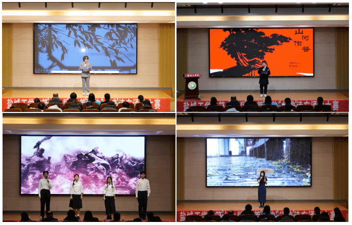 本次比赛吸引了全校各二级学院70支队伍、百余名选手参与。经过初赛、复赛的激烈角逐,14支队伍脱颖而出,会师决赛。“身长翅膀吧脚生云,再回延安看母亲!”材料工程学院陈沪凤等同学以浑厚深情的朗诵,将那份对延安的赤子之情化为穿越时空的呼唤,让红色圣地的温暖久久回荡。“但是太阳,他每时每刻都是夕阳也都是旭日。”化工学院刘亦轩同学以沉静哲思的语调,引领观众在落日与朝阳的交替中,体悟生命永恒的光明。“我希望飘过一个丁香一样地结着愁怨的姑娘。”海生学院滕文聪同学嗓音轻柔婉转,仿佛铺展开江南雨巷的朦胧画卷,让诗意的惆怅浸润每个人的心怀。“我们相信,中国一定有个可赞美的光明前程。”人文学院吴霜同学用清澈而坚定的声音,勾勒出民族复兴的壮阔图景,传递出新时代青年对祖国未来的炽热信心。