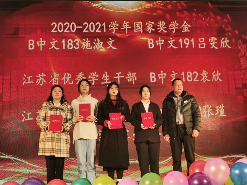 何登溢为“2020-2021学年国家奖学金”、“江苏省优秀学生干部”、“江苏省三好学生”获得者颁奖