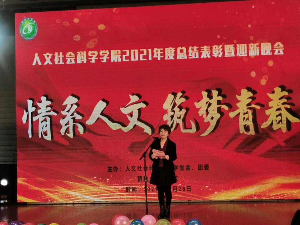 12月26日晚,“情系人文,筑梦青春”人文社会科学学院2021年度总结表彰暨迎新晚会在建军东路校区五四报告厅举行。学院党总支书记何登溢、院长周晓燕、副院长陶文俊、党总支副书记姚爱华和师生代表300余人参加。