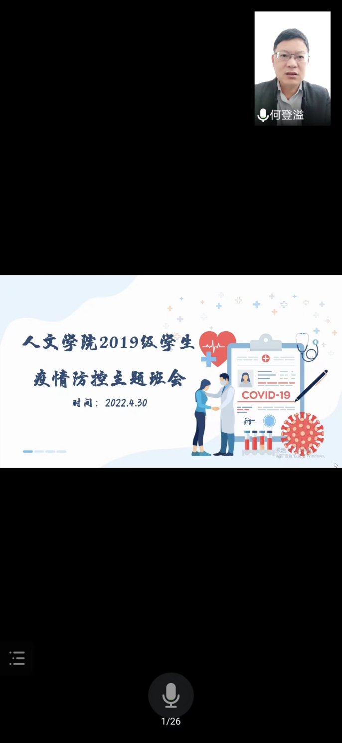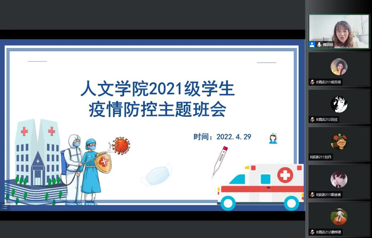 为做好“五一假期”学生安全稳定工作,进一步筑牢安全底线,人文学院全体专兼职辅导员在4月29日—30日召开责任班级疫情防控主题班会。