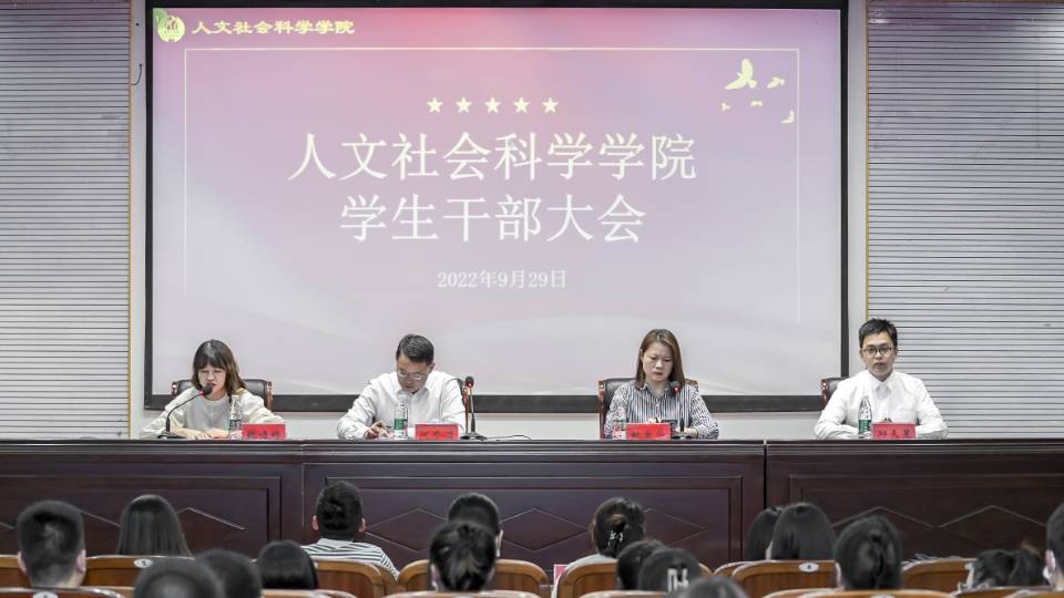 9月29日晚,人文社会科学学院在南校区土木馆报告厅召开2022年秋学期学生干部大会。学院党总支书记何澄溢、党总支副书记姚爱华出席,分团委书记邱天星、专兼职辅导员、全体学生干部参加,学工办副主任魏语婷主持。