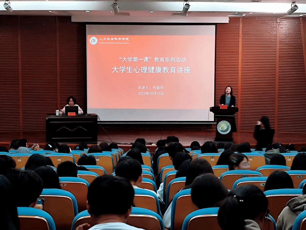 10月13日,人文学院在润美楼报告厅举办2023级新生“大学第一课”教育系列活动。学生处副处长、大学生心理健康教育中心主任韦春华,图书馆文献检索部主任秦殿启应邀主讲。新生辅导员及2023级全体新生参加,活动由学院党总支副书记姚爱华主持。