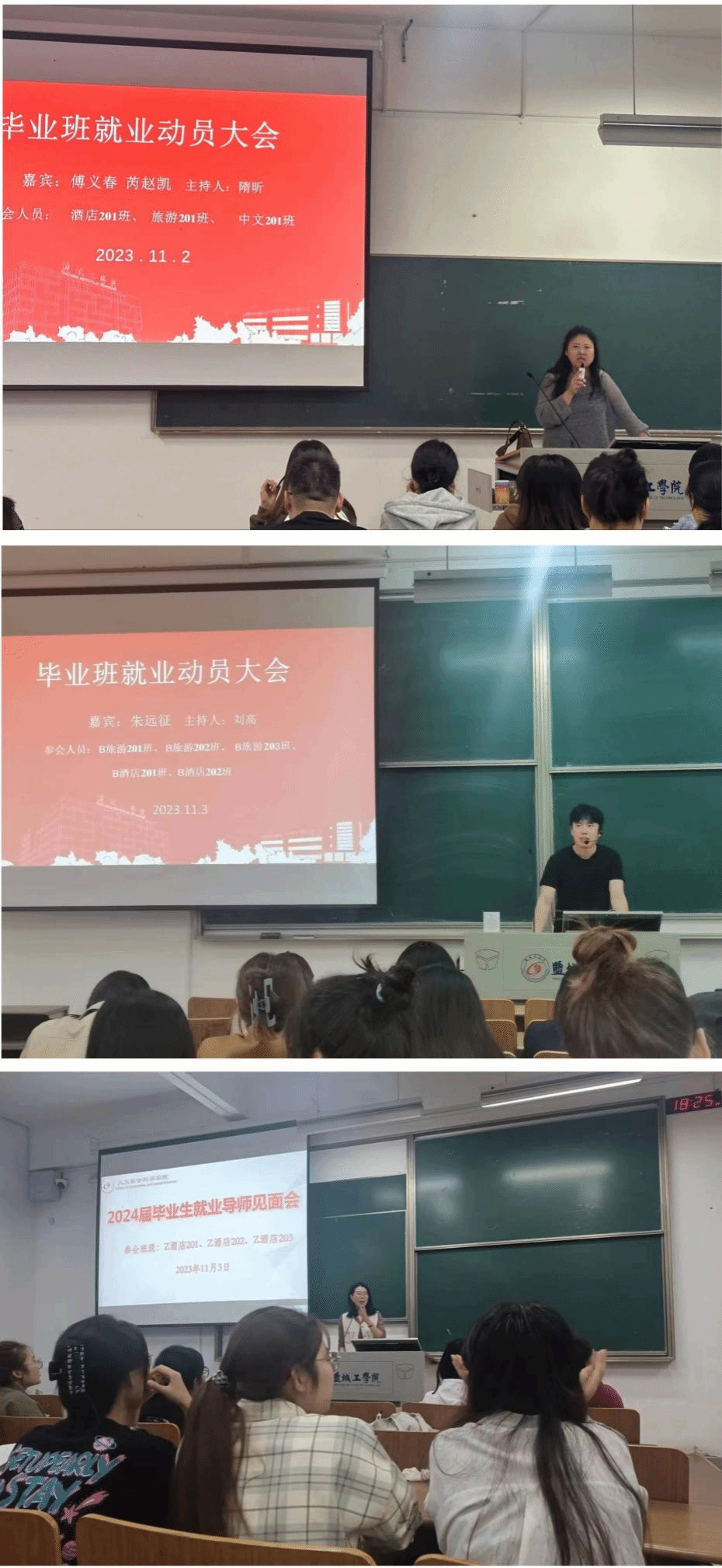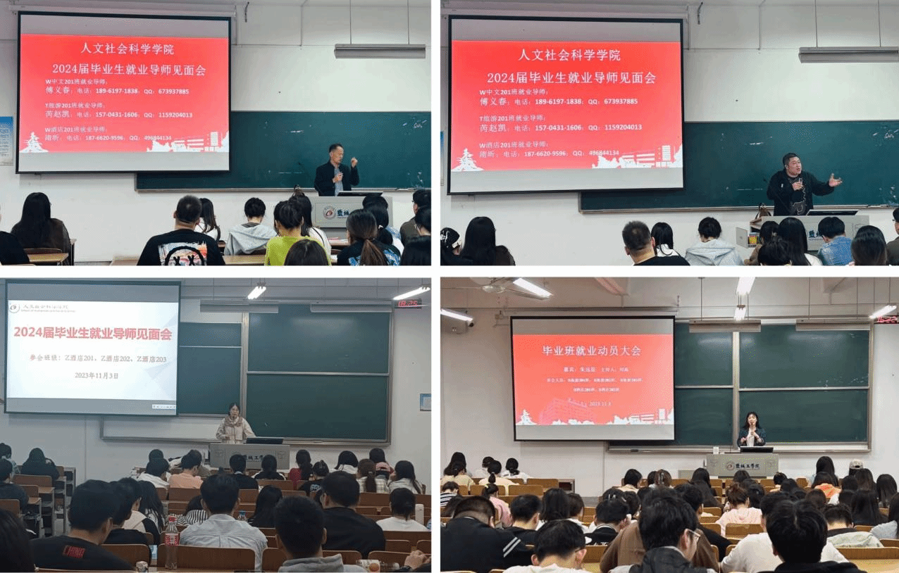 为贯彻落实11月1日学院全员推进就业动员大会所提出的“就业导师制”,扎实做好2024届毕业生就业指导与服务工作,切实促进毕业生更高质量就业。11月2日和11月3日下午,人文学院各毕业班辅导员于博学楼召开2024届毕业班就业动员班会暨就业导师见面会。汉语言文学专业、旅游管理专业以及酒店管理专业的就业导师应邀出席,2024届毕业生及毕业班辅导员参加。