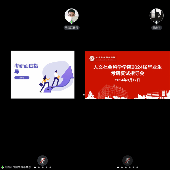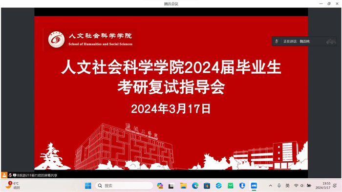 为帮助2024届考研学生明确方向,把握机遇、坚定信心,从容应对研究生复试与调剂工作,2024年3月17日下午19:00,人文学院运用腾讯会议线上召开2024届毕业生考研复试指导会。学院党总支副书记姚爱华、全体毕业班辅导员及2024届考研学生参加会议,往届考研上岸学生江抒阳、王晨宇应邀分享复试及调剂经验,会议由学工办副主任魏语婷主持。