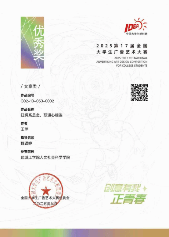 近日,第十六届全国大学生广告艺术大赛(以下简称“大广赛”)获奖名单公布,人文学院汉语言文学专业学生王萍的文案类作品《红绳系思念 联通心相连》荣获全国优秀奖,该作品由魏语婷、汤军、刘伟等老师指导。值得一提的是,大广赛是教育部认可的全国普通高校大学生竞赛榜单内赛事,含金量十足。