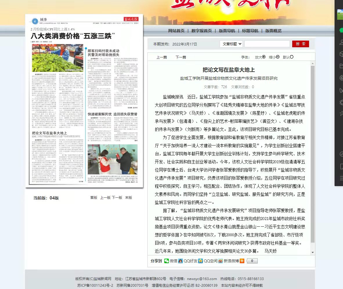 从2021年3月至今,我校人文社会科学学院2019级马天娇、包清清等五位同学在博士后、台湾大学访问学者张翠爱教授的指导下,积极展开了“盐城非物质文化遗产传承发展”的项目研究。至此,该项目研究目标已基本完成,人文社会科学学院院长周晓燕和书记何登溢对此成果予以肯定。
