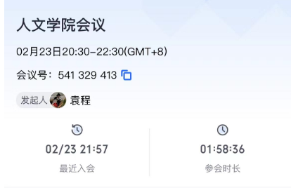 2月23日晚20:30,人文学院线上举办中国国际大学生创新大赛交流大会,大会由袁程主持,人文学院院长周晓燕,中文系主任蒋继华,酒店系主任祝仁革及教师代表陈思博、刘伟参加座谈交流,各年级学生踊跃报名参赛,负责人韦臣智、刘婷婷、刘瑞、王萍、张鹏、张宏伟、徐子凌、蔡晶晶、王天娇、葛正天、陆澄、姜越、王亚楠、金志洲、杨奇、马大豪、蒋诗语、袁善琦、邱子涵、袁曹昕、朱荷、段芷煜共22人汇报团队项目进程,畅谈自身创意想法。