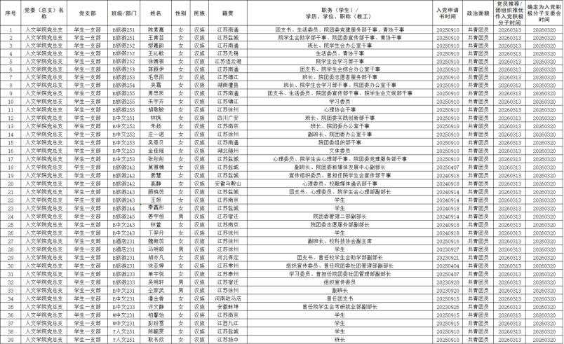 按照《中共盐城工学院委员会发展党员工作实施细则(2020 年修订)》(盐工委〔2020〕47号)有关规定,根据个人现实表现、党支部培养教育考察情况和各团支部推优,在广泛听取各方面意见建议后,经人文学院学生第一党支部委员会研究讨论并报学院党总支,同意将陈素嘉等39名同学确定为入党积极分子。现将名单公示如下: