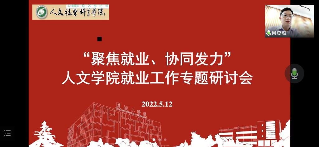 5月12日下午,人文学院线上线下同步召开“聚焦就业、协同发力”就业工作专题研讨会,全体院领导、专业系负责人、职能科室负责人、毕业班辅导员参加,党总支书记何登溢主持研讨会。