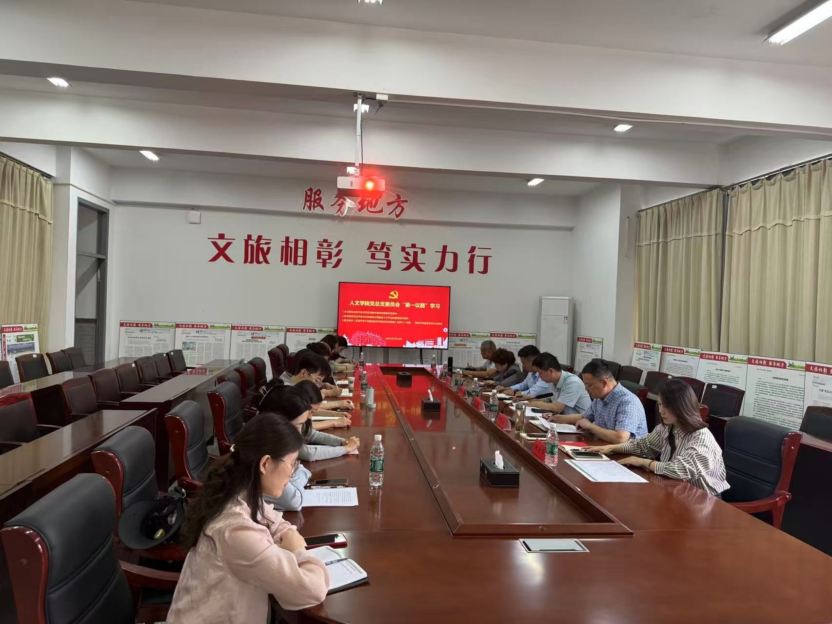 5月26日上午,在仁和楼A304会议室,人文学院党总支委员会以“第一议题”学习习近平总书记在河南考察时的重要讲话精神、习近平总书记对精神文明建设工作作出的重要指示精神,原文领学《习近平关于加强党的作风建设论述摘编》的第九个专题“推进作风建设常态化长效化”。校党委第二巡察组巡察专员、保卫处处长李义峰、马克思主义学院副院长马荣列席指导。会议由学院党总支书记何登溢主持,党总支委员会委员及中心组成员参加。