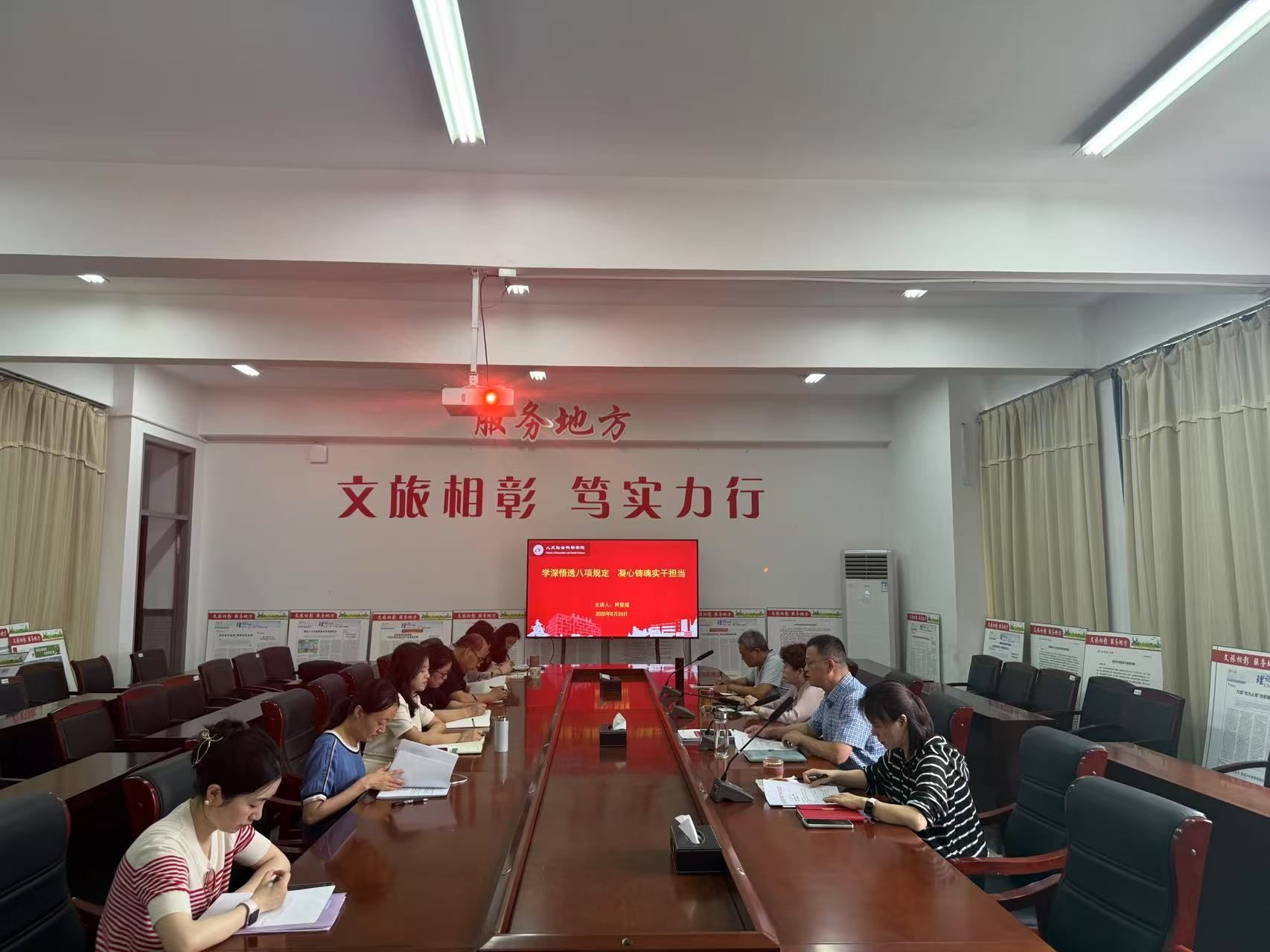 6月24日上午,在仁和楼A304会议室,人文学院党总支书记何登溢以《学深悟透八项规定 凝心铸魂实干担当》为题讲授专题党课。学院中心组成员参加。