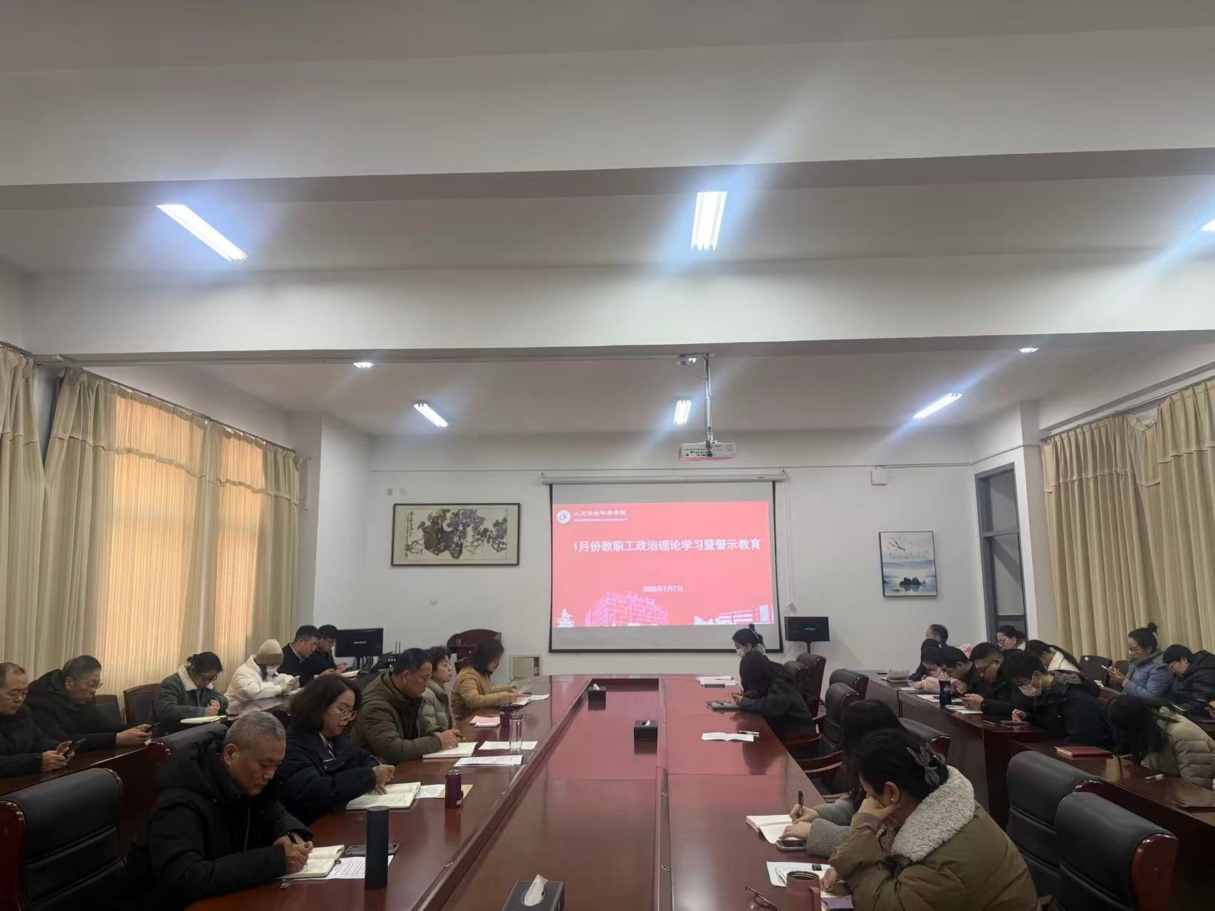1月7日下午,人文学院在南校区仁和楼A304会议室召开1月份教职工政治理论学习暨警示教育。会议由学院党总支书记何登溢主持,全体教职工参加。