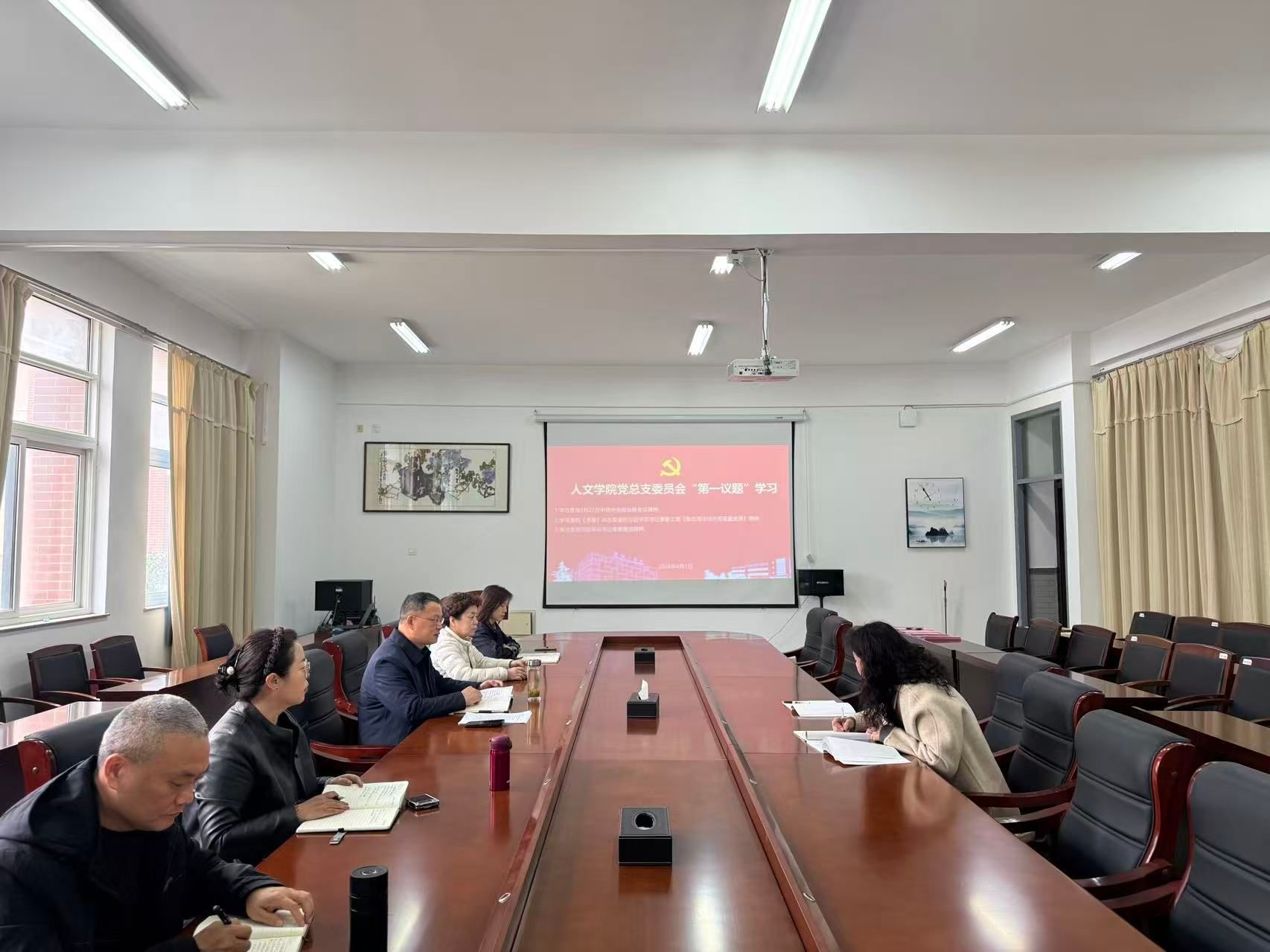 4月1日下午,在仁和楼A304会议室,人文学院党总支委员会以“第一议题”学习3月27日中共中央政治局会议精神和习近平总书记近期重要文章重要复信精神。会议由学院党总支书记何登溢主持,党总支委员会委员参加。