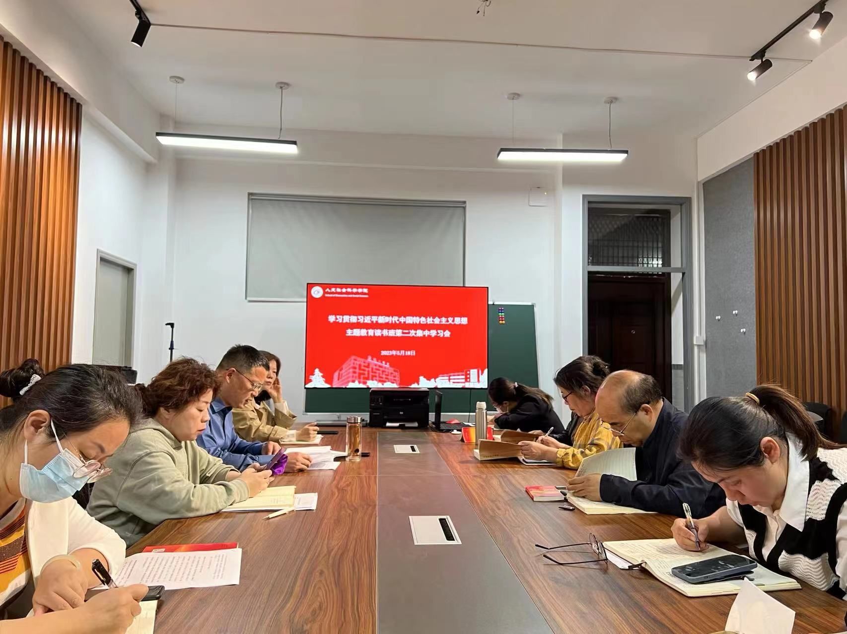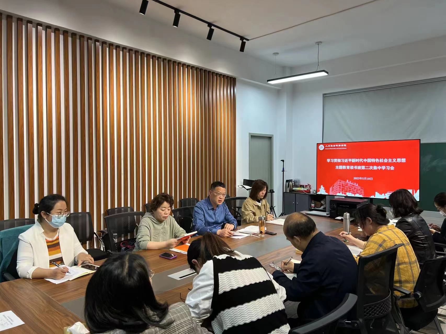 5月18日上午,在仁和楼A302会议室,人文学院党总支组织学习贯彻习近平新时代中国特色社会主义思想主题教育读书班第二次集中学习会。会议由学院党总支书记何登溢主持,中心组全体成员参加。