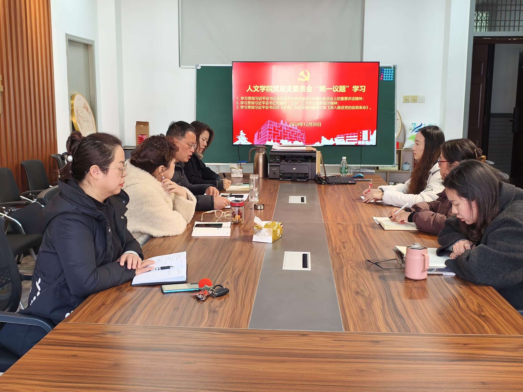 12月30日上午,在仁和楼A302会议室,人文学院党总支委员会以“第一议题”学习习近平总书记在纪念乔石同志诞辰100周年座谈会上发表重要讲话精神、对做好“三农”工作作出的重要指示精神、《求是》杂志发表习近平总书记重要文章《深入推进党的自我革命》精神。会议由学院党总支书记何登溢主持,党总支委员会委员及支部书记参加。