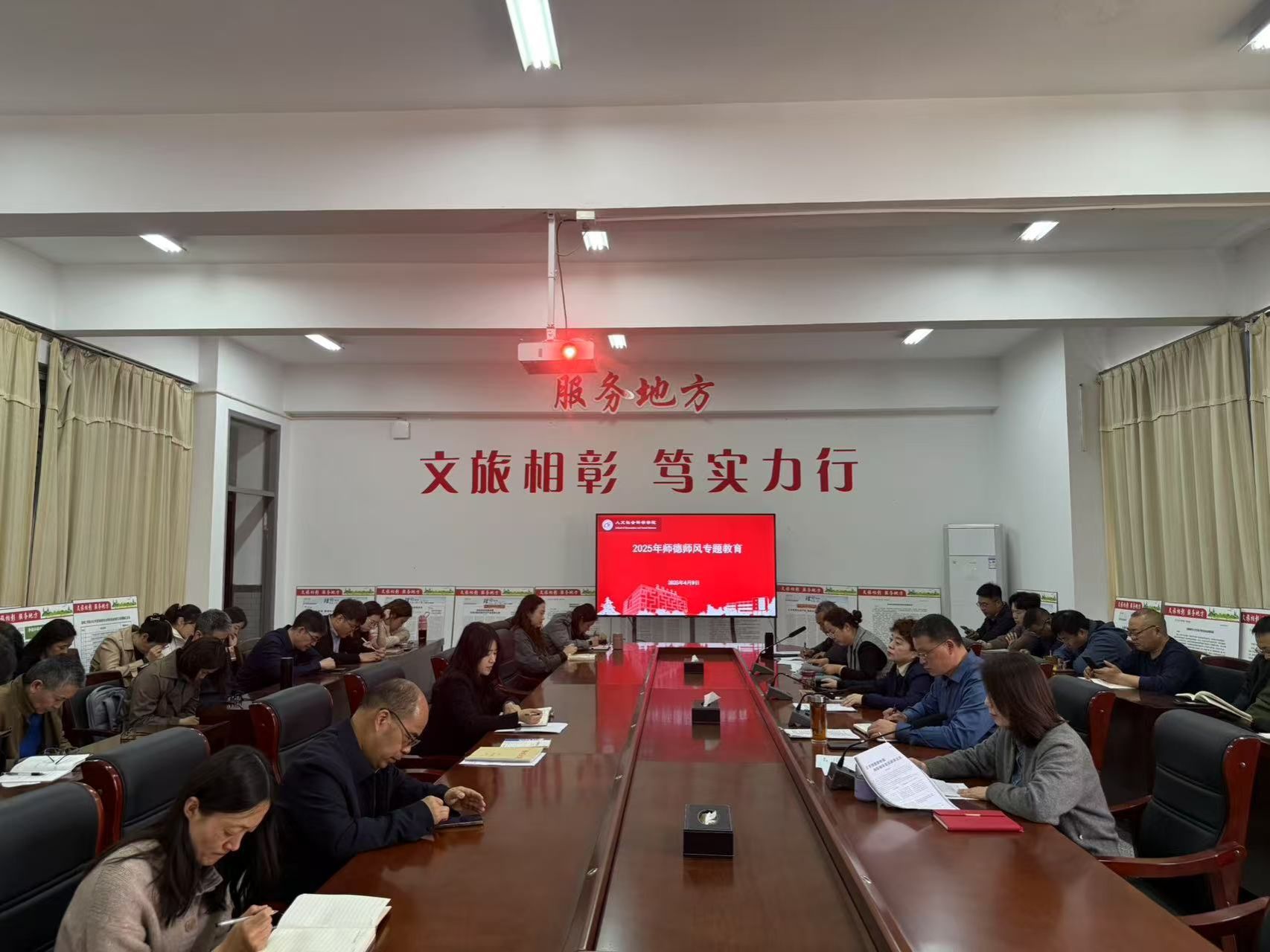 4月9日下午,人文学院在南校区仁和楼A304会议室开展2025年师德师风专题教育。会议由学院党总支副书记姚爱华主持,学院教职工参加会议。